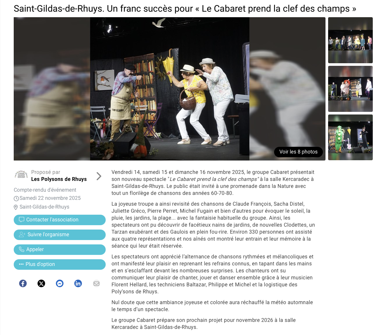 Une nouvelle aventure va commencer pour la dynamique troupe des Poly’sons de Rhuys ce vendredi 14 novembre par une série de concerts salle Kercaradec de Saint-Gildas-de-Rhuys. Cette année le thème a pour titre : « Le cabaret prend la clef des champs ». Au programme, 32 chansons tirées d’un répertoire composé uniquement de chansons françaises bien connues de tous. Les morceaux choisis sont interprétés par treize chanteurs et chanteuses formant quatre chœurs, accompagnés à l’accordéon et clavier par Florent Hellard un musicien professionnel.